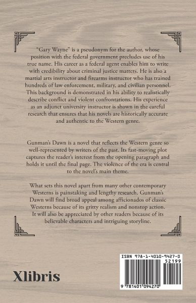 Gunman's Dawn is a novel that reflects the Western genre so well-represented by writers of the past. Its fast-moving plot captures the reader's interest from the opening paragraph and holds it until the final page. The violence of the era is central to the novel's main theme. What sets this novel apart from many other contemporary Westerns is painstaking and lengthy research. Gunman's Dawn will find broad appeal among afficionados of classic Westerns because of its gritty realism and nonstop action. It will also be appreciated by other readers because of its believable characters and intriguing storyline.