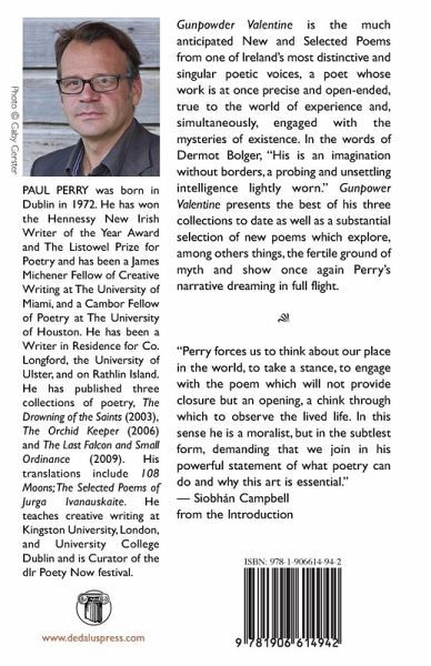Gunpowder Valentine is the much anticipated New and Selected Poems from one of Ireland's most distinctive and singular poetic voices, a poet whose work is at once precise and open-ended, true to the world of experience and, simultaneously, engaged with the mysteries of existence. In the words of Dermot Bolger, "His is an imagination without borders, a probing and unsettling intelligence lightly worn." Gunpower Valentine presents the best of his three collections to date as well as a substantial selection of new poems which explore, among others things, the fertile ground of myth and show once again Perry's narrative dreaming in full flight. "Perry forces us to think about our place in the world, to take a stance, to engage with the poem which will not provide closure but an opening, a chink through which to observe the lived life. In this sense he is a moralist, but in the subtlest form, demanding that we join in his powerful statement of what poetry can do and why this art is essential." - Siobhán Campbell, from the Introduction