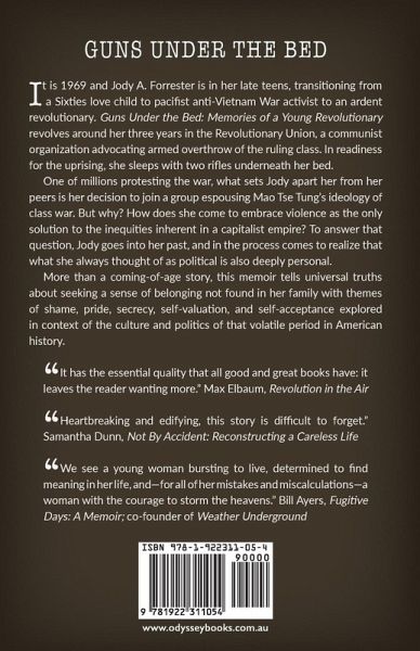 It is 1969 and Jody A. Forrester is in her late teens, transitioning from a Sixties love child to pacifist anti-Vietnam War activist to an ardent revolutionary. Guns Under the Bed: Memories of a Young Revolutionary revolves around her three years in the Revolutionary Union, a Communist organization advocating armed overthrow of the ruling class. In readiness for the uprising, she sleeps with two rifles underneath her bed. One of millions protesting the war, what sets Jody apart her from her peers is her decision to join a group espousing Mao Tse Tung's ideology of class war. But why? How does she come to embrace violence as the only solution to the inequities inherent in a capitalist empire? To answer that question, Jody goes into her past, and in the process comes to realize that what she always thought of as political is also deeply personal. More than a coming-of-age story, this memoir tells universal truths about seeking a sense of belonging not found in her family with themes of shame, pride, secrecy, self-valuation, and self-acceptance explored in context of the culture and politics of that volatile period in American history.