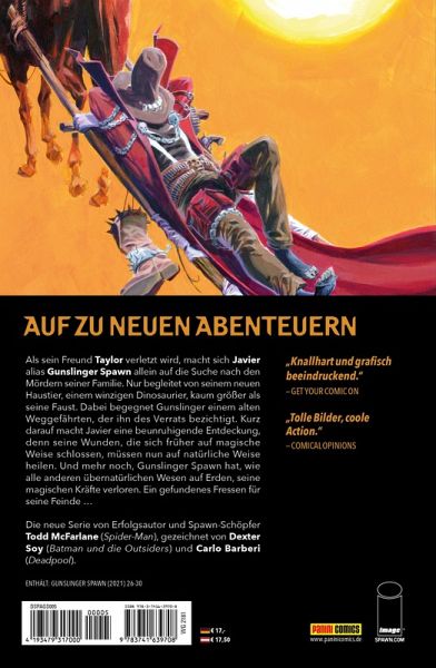 AUF ZU NEUEN ABENTEUERNAls sein Freund Taylor verletzt wird, macht sich Javier alias Gunslinger Spawn allein auf die Suche nach dem Mörder seiner Familie. Nur begleitet von seinem neuen Haustier, einem winzigen Dinosaurier, kaum größer als seine Faust. Dabei begegnet Gunslinger einem alten Weggefährten, der ihn des Verrats bezichtigt. Kurz darauf macht Javier eine beunruhigende Entdeckung, denn seine Wunden, die sich früher auf magische Weise schlossen, müssen nun auf natürliche Weise heilen. Und mehr noch, Gunslinger Spawn hat, wie alle anderen übernatürlichen Wesen auf Erden, seine magischen Kräfte verloren. Ein gefundenes Fressen für seine Feinde ...Die neue Serie von Erfolgsautor und Spawn-Schöpfer Todd McFarlane (Spider-Man), gezeichnet von Dexter Soy (Batman und die Outsiders) und Carlo Barberi (Deadpool).ENTHÄLT: GUNSLINGER SPAWN (2021) 26-30