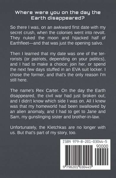 Where were you on the day the Earth disappeared? So there I was, on an awkward first date with my secret crush, when the colonies went into revolt. They nuked the moon and hijacked half of Earthfleet-and that was just the opening salvo. Then I learned that my date was one of the terrorists (or patriots, depending on your political beliefs), and I had to make a choice: join her, or spend the next few days stuffed in an EVA suit locker. I chose the former, and that's the only reason I'm still here. The name's Rex Carter. On the day the Earth disappeared, the civil war had just broken out, and I didn't know which side I was on. All I knew was that my homeworld had been swallowed by an alien anomaly, and I had to get to Jane and Sam, my gunslinging sister and brother-in-law. Unfortunately, the Kletchkas are no longer with us. But that's part of my story, too.