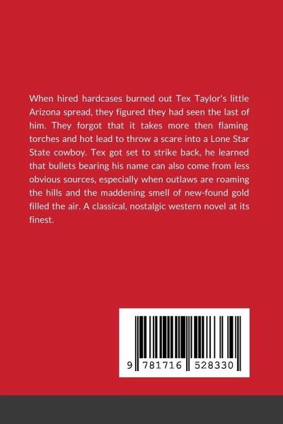 When hired hardcases burned out Tex Taylor's little Arizona spread, they figured they had seen the last of him. They forgot that it takes more then flaming torches and hot lead to throw a scare into a Lone Star State cowboy. Tex got set to strike back, he learned that bullets bearing his name can also come from less obvious sources, especially when outlaws are roaming the hills and the maddening smell of new-found gold filled the air. A classical, nostalgic western novel at its finest.