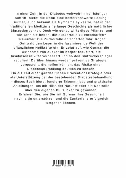 In einer Zeit, in der Diabetes weltweit immer häufiger auftritt, bietet die Natur eine bemerkenswerte Lösung: Gurmar, auch bekannt als Gymnema sylvestre, hat in der traditionellen Medizin eine lange Geschichte als natürlicher Blutzuckersenker. Doch wie genau wirkt diese Pflanze, und wie kann sie helfen, die Zuckerfalle zu entschärfen?In Gurmar: Die Zuckerfalle entschärfen führt Roger Gottwald den Leser in die faszinierende Welt der pflanzlichen Heilkräfte ein. Er zeigt auf, wie Gurmar die Aufnahme von Zucker im Körper reduziert, die Insulinsensitivität verbessert und so den Blutzuckerspiegel reguliert. Darüber hinaus werden präventive Strategien vorgestellt, die helfen können, das Risiko einer Diabeteserkrankung deutlich zu senken.Ob als Teil einer ganzheitlichen Präventionsstrategie oder als Unterstützung bei der bestehenden Diabetesbehandlung - dieses Buch bietet fundierte Erkenntnisse und praktische Anleitungen, um mit Hilfe der Natur wieder die Kontrolle über den eigenen Blutzucker zu gewinnen.Erfahren Sie, wie Sie mit Gurmar Ihre Gesundheit nachhaltig unterstützen und die Zuckerfalle erfolgreich umgehen können.