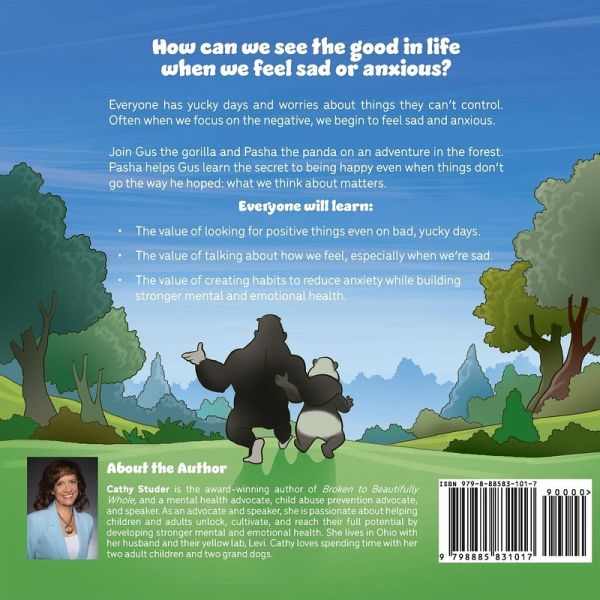 *Endorsed by pediatric psychologist, counselors, and teachers and qualifies for social and emotional learning hours. How can we see the good in life when we feel sad or anxious? Everyone has yucky days and worries about things they can't control. Often when we focus on the negative, we begin to feel sad and anxious. Join Gus the gorilla and Pasha the panda on an adventure in the forest. Pasha helps Gus learn the secret to being happy even when things don't go the way we hoped: what we think about matters. Everyone will learn: ~ The value of looking for positive things even on bad, yucky days. ~ The value of talking about how we feel, especially when we are sad. ~ The value of creating habits to reduce anxiety while building stronger mental and emotional health. A healthy perspective helps us build stronger mental and emotional health which guides all of us to develop our best potentials. Valuable resources in the back of the book with an extra FREE guide with activities for parents and teachers. Check out the lovable companions at www.cathystuder.com!