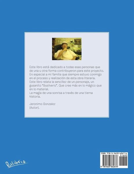 Este libro está dedicado a todas esas personas que de una u otra forma contribuyeron para este proyecto. En especial a mi familia que siempre estuvo conmigo en el proceso y realización de esta obra literaria. Este libro relata la sencillez de un personaje, un gusanito "Gusilverio". Que cree más en lo mágico que en lo material. La magia de una sonrisa a través de una tierna historia. Jeronimo Gonzalez (Autor).