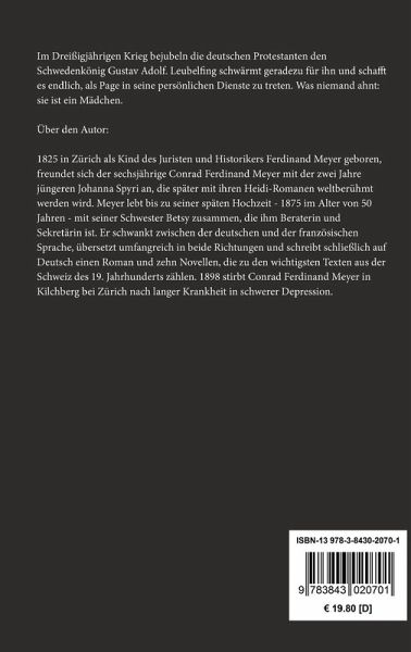 Conrad Ferdinand Meyer: Gustav Adolfs Page Im Dreißigjährigen Krieg bejubeln die deutschen Protestanten den Schwedenkönig Gustav Adolf. Leubelfing schwärmt geradezu für ihn und schafft es endlich, als Page in seine persönlichen Dienste zu treten. Was niemand ahnt: sie ist ein Mädchen. Erstdruck in: Deutsche Rundschau (Berlin), 1882. Vollständige Neuausgabe mit einer Biographie des Autors. Herausgegeben von Karl-Maria Guth. Berlin 2013. Textgrundlage ist die Ausgabe: Conrad Ferdinand Meyer: Sämtliche Werke in zwei Bänden. Vollständiger Text nach den Ausgaben letzter Hand. Mit einem Nachwort von Erwin Laaths, München: Winkler, 1968. Die Paginierung obiger Ausgabe wird in dieser Neuausgabe als Marginalie zeilengenau mitgeführt. Umschlaggestaltung von Thomas Schultz-Overhage unter Verwendung des Bildes: Jacob Heinrich Elbfas, Gustav Adolf, um 1630. Gesetzt aus Minion Pro, 11 pt. Über den Autor: 1825 in Zürich als Kind des Juristen und Historikers Ferdinand Meyer geboren, freundet sich der sechsjährige Conrad Ferdinand Meyer mit der zwei Jahre jüngeren Johanna Spyri an, die später mit ihren Heidi-Romanen weltberühmt werden wird. Meyer lebt bis zu seiner späten Hochzeit - 1875 im Alter von 50 Jahren - mit seiner Schwester Betsy zusammen, die ihm Beraterin und Sekretärin ist. Er schwankt zwischen der deutschen und der französischen Sprache, übersetzt umfangreich in beide Richtungen und schreibt schließlich auf Deutsch einen Roman und zehn Novellen, die zu den wichtigsten Texten aus der Schweiz des 19. Jahrhunderts zählen. 1898 stirbt Conrad Ferdinand Meyer in Kilchberg bei Zürich nach langer Krankheit in schwerer Depression.