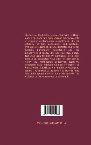 The texts of the book are concerned with G. Bergmann's open and new problems and their active role on issues in contemporary metaphysics, like the ontology of ties, connexions and relations, problems of exemplification, substrates and tropes theories, particulars, persistence and the metaphysics of space, time and existence. Papers deal with these themes by themselves, or discuss them in an associated way: some of them aim to clarify the complicated conceptual Relations Bergmann have enlarged with major themes of philosophers like Aristotle, Brentano, Meinong and Sellars. The purpose of the book is to provide some light on his central interests, but also in regard of the evolution of the actual scope of his thought.