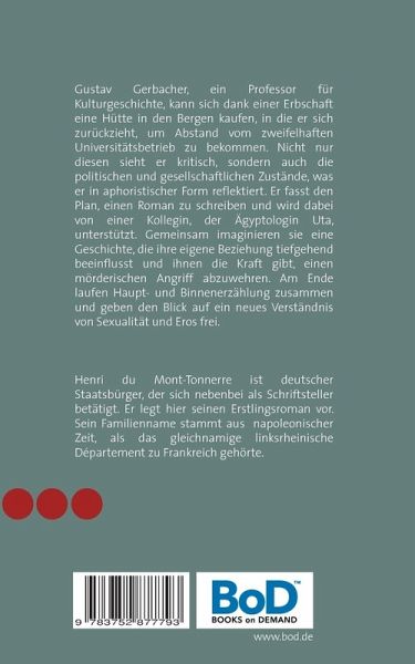 Gustav Gerbacher, ein Professor fürKulturgeschichte, kann sich dank einer Erbschafteine Hütte in den Bergen kaufen, in die er sichzurückzieht, um Abstand vom zweifelhaftenUniversitätsbetrieb zu bekommen. Nicht nurdiesen sieht er kritisch, sondern auch diepolitischen und gesellschaftlichen Zustände, waser in aphoristischer Form reflektiert. Er fasst denPlan, einen Roman zu schreiben und wird dabeivon einer Kollegin, der Ägyptologin Uta,unterstützt. Gemeinsam imaginieren sie eineGeschichte, die ihre eigene Beziehung tiefgehendbeeinflusst und ihnen die Kraft gibt, einenmörderischen Angriff abzuwehren. Am Endelaufen Haupt- und Binnenerzählung zusammenund geben den Blick auf ein neues Verständnisvon Sexualität und Eros frei.