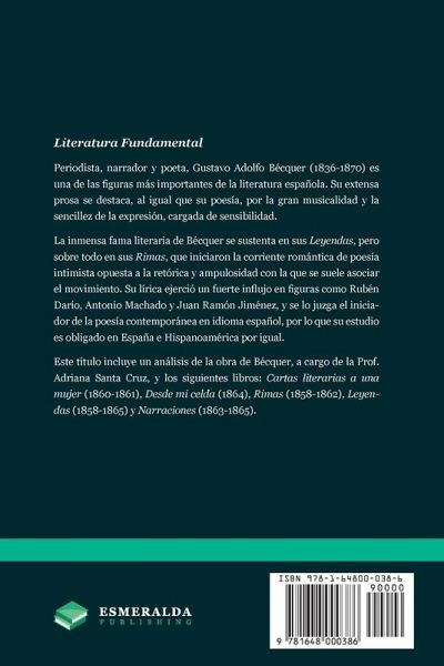 Literatura Fundamental Periodista, narrador y poeta, Gustavo Adolfo Bécquer (1836-1870) es una de las figuras más importantes de la literatura española. Su extensa prosa se destaca, al igual que su poesía, por la gran musicalidad y la sencillez de la expresión, cargada de sensibilidad. La inmensa fama literaria de Bécquer se sustenta en sus Leyendas, pero sobre todo en sus Rimas, que iniciaron la corriente romántica de poesía intimista opuesta a la retórica y ampulosidad con la que se suele asociar el movimiento. Su lírica ejerció un fuerte influjo en figuras como Rubén Darío, Antonio Machado y Juan Ramón Jiménez, y se lo juzga el iniciador de la poesía contemporánea en idioma español, por lo que su estudio es obligado en España e Hispanoamérica por igual. Este título incluye un análisis de la obra de Bécquer, a cargo de la Prof. Adriana Santa Cruz, y los siguientes libros: Cartas literarias a una mujer (1860-1861), Desde mi celda (1864), Rimas (1858-1862), Leyendas (1858-1865) y Narraciones (1863-1865). A master of late Romanticism, Gustavo Adolfo Bécquer (Spain, 1836-1870) is one of the most famous and celebrated authors across Spain and Latin America. His works (including Leyendas and Rimas) have been best sellers since their original publication in the 19th century. Often compared to Edgar Allan Poe, his natural style influenced Rubén Darío, Antonio Machado and Juan Ramón Jiménez, among others. Gustavo Adolfo Bécquer - Selección de Obras includes the author's most important works (Cartas literarias a una mujer, Desde mi celda, Rimas, Leyendas and Narraciones), as well as a literary analysis chapter.