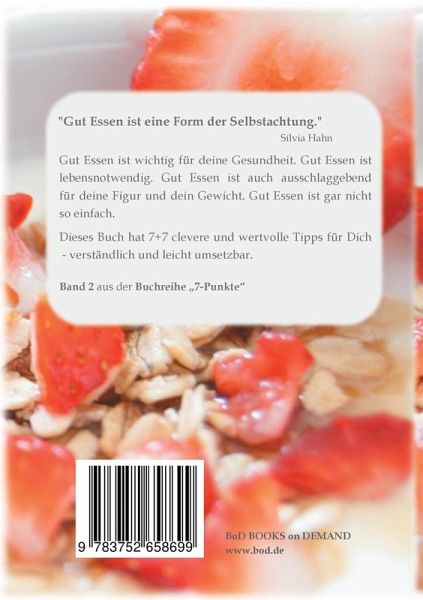 "Gut Essen ist eine Form der Selbstachtung." Silvia HahnGut Essen ist wichtig für deine Gesundheit. Gut Essen ist lebensnotwendig. Gut Essen ist auch ausschlaggebend für deine Figur und dein Gewicht. Gut Essen ist gar nicht so einfach. Dieses Buch hat 7+7 clevere und wertvolle Tipps für Dich - verständlich und leicht umsetzbar.
