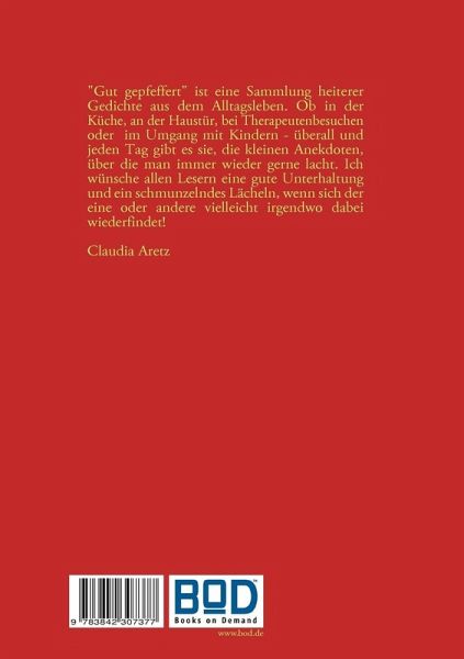 "Gut gepfeffert" ist eine Sammlung heiterer Gedichte aus dem Alltagsleben. Ob in der Küche, an der Haustür, bei Therapeutenbesuchen oder im Umgang mit Kindern - überall und jeden Tag gibt es sie, die kleinen Anekdoten, über die man immer wieder gerne lacht. In den erfrischend heiter beschriebenen Gedichten findet sich der eine oder andere Leser bestimmt mit einem Schmunzeln wieder...