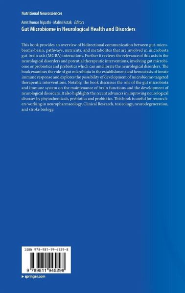 This book provides an overview of bidirectional communication between gut-microbiome-brain, pathways, nutrients, and metabolites that are involved in microbiota gut-brain axis (MGBA) interactions. Further it reviews the relevance of this axis in the neurological disorders and potential therapeutic interventions, involving gut microbiome or probiotics and prebiotics which can ameliorate the neurological disorders. The book examines the role of gut microbiota in the establishment and hemostasis of innate immune response and explores the possibility of development of microbiome-targeted therapeutic interventions. Notably, the book discusses the role of the gut microbiota and immune system on the maintenance of brain functions and the development of neurological disorders. It also highlights the recent advances in improving neurological diseases by phytochemicals, prebiotics and probiotics. This book is useful for researchers working in neuropharmacology, Clinical Research, toxicology, neurodegeneration, and stroke biology.