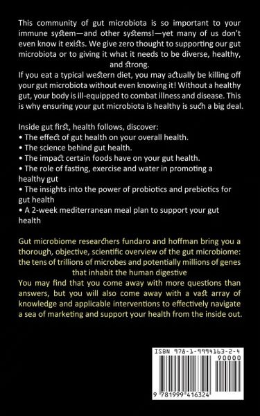This community of gut microbiota is so important to your immune system-and other systems!-yet many of us don't even know it exists. We give zero thought to supporting our gut microbiota or to giving it what it needs to be diverse, healthy, and strong. If you eat a typical western diet, you may actually be killing off your gut microbiota without even knowing it! Without a healthy gut, your body is ill-equipped to combat illness and disease. This is why ensuring your gut microbiota is healthy is such a big deal. Inside gut first, health follows, discover:The effect of gut health on your overall health. The science behind gut health. The impact certain foods have on your gut health. The role of fasting, exercise and water in promoting a healthy gut The insights into the power of probiotics and prebiotics for gut health A 2-week mediterranean meal plan to support your gut health Gut microbiome researchers fundaro and hoffman bring you a thorough, objective, scientific overview of the gut microbiome: the tens of trillions of microbes and potentially millions of genes that inhabit the human digestive You may find that you come away with more questions than answers, but you will also come away with a vast array of knowledge and applicable interventions to effectively navigate a sea of marketing and support your health from the inside out.
