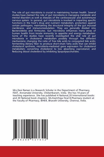 The role of gut microbiota is crucial in maintaining human health. Several studies have claimed the role of gut microbiota in managing metabolic and mental disorders as well as diseases of the cardiovascular and autoimmune nervous system. In general, gut microbiota is involved in imparting specific functions in the host's drug and nutrient metabolism, protection against certain pathogens, maintaining the structural integrity of the gut mucosal membrane, and immunomodulation. They are generally divided into Bacteroidetes and Firmicutes. Gut microbiota influences many areas of human health from innate immunity to appetite and energy metabolism. Some of the studies have recently investigated the vital role of gut microbiota in cholesterol metabolism possibly through five different mechanisms; changing the ratio of free bile acids to conjugated bile acids; fermenting dietary fiber to produce short-chain fatty acids that can inhibit cholesterol synthesis; microbiota-mediated gene expression for cholesterol metabolism; converting cholesterol to low absorbing coprostanol; and Reducing blood cholesterol by inhibiting lipopolysaccharides.