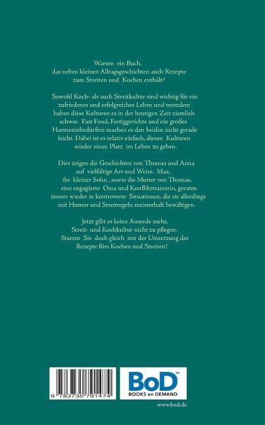 Warum ein Buch, das neben kleinen Alltagsgeschichten auch Rezepte zum Streiten und Kochen enthält? Sowohl Koch- als auch Streitkultur sind wichtig für ein zufriedenes und erfolgreiches Leben und trotzdem haben beide Kulturen es in der heutigen Zeit ziemlich schwer. Fast Food, Fertiggerichte und ein großes Harmoniebedürfnis machen es den beiden nicht ganz leicht. Dabei ist es relativ einfach, diesen Kulturen wieder einen Platz im Leben zu geben.Dies zeigen die Geschichten von Thomas und Anna auf die vielfältigste Art und Weise. Max, der kleine Sohn der beiden, sowie die Mutter von Thomas, eine engagierte Oma und Konflikttrainerin, geraten immer wieder in kontroverse Situationen, die sie allerdings mit Humor und Streitregeln meisterhaft bewältigen.Jetzt gibt es keine Ausrede mehr, Streit- und Kochkultur nicht zu pflegen. starten Sie gleich heute mit der Umsetzung der Rezepte fürs Kochen und Streiten!