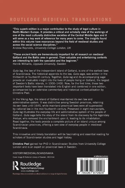 In the Viking Age, the island of Gotland maintained its own law and administrative system. It was distinctive among Swedish provinces, retaining its own laws until 1645 while mainland provincial laws were all superseded by national law in the mid-fourteenth century. Preserved in eight manuscripts, it illustrates the everyday life and administrative system of the people of Gotland. Guta Saga tells the story of the island from its discovery by the legendary Þieluar, who removed the enchantment upon it which led to its inhabitation. Read together, the texts provide a complete picture of an island unique among Scandinavian provinces, offering a rare view of everyday people in medieval Scandinavia.