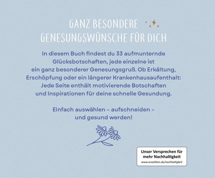 Du möchtest einem lieben Menschen gute Besserung wünschen? Dieses originelle Buch mit Seiten zum Aufschneiden ist ein ganz besonderer Genesungsgruß. Auf jeder seiner 33 Aufschneideseiten hält es eine aufmunternde Glücksbotschaft bereit. Ob Erkältung, Erschöpfung oder ein längerer Krankenhausaufenthalt: Jede Seite enthält motivierende Botschaften und Inspirationen für eine schnelle Gesundung.