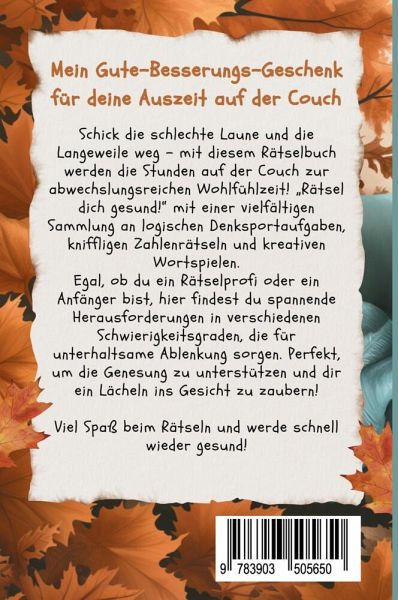 Mein Gute-Besserungs-Geschenk für dich! Schick die schlechte Laune und die Langeweile weg - mit diesem Rätselbuch werden die Stunden auf der Couch zur abwechslungsreichen Wohlfühlzeit! "Rätsel dich gesund!" mit einer vielfältigen Sammlung an logischen Denksportaufgaben wie Hitori, Binairo, Labyrinth und Slitherlink für die, die gerne um die Ecke denken, kniffligen Zahlenrätseln wie Sudoku, Futoshiki und Kakuro, die eine willkommene Abwechslung bringen und kreativen Wortspielen wie Kreuzworträtsel und Buchstabensalat für pfiffige Sprachliebhaber.Ob Einsteiger oder Rätselprofi, dieses Buch bietet Herausforderungen in verschiedenen Schwierigkeitsgraden, damit wirklich jeder etwas davon hat - vom leichten Zeitvertreib bis zur echten Denksportaufgabe.Perfekt, um die Genesung zu unterstützen und dir ein Lächeln ins Gesicht zu zaubern!Viel Spaß beim Rätseln und werde schnell wieder gesund!Schnapp dir dieses sinnvolle Rätselbuch und mache einem lieben Menschen, der gerade nicht auf der Höhe ist, eine echte Freude!