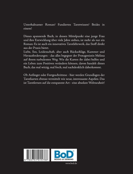 Unterhaltsamer Roman? Fundiertes Tarotwissen? Beides in einem!Dieses spannende Buch, in dessen Mittelpunkt eine junge Frau und ihre Entwicklung über viele Jahre stehen, ist mehr als nur ein Roman: Es ist auch ein innovatives Tarotlehrwerk, das Stoff direkt aus der Praxis bietet.Liebe, Sex, Leidenschaft, aber auch Rückschläge, Kummer und Herausforderungen - das alles begegnet der Protagonistin Melissa auf ihrem turbulenten Weg. Wie die Karten ihr dabei helfen und ein Leben zum Positiven verändern können, davon handelt dieses Buch, das mal witzig, mal frech, mal nachdenklich daherkommt.Ob Anfänger oder Fortgeschrittene - hier werden Grundlagen der Tarotkarten ebenso vermittelt wie neue, interessante Aspekte. Das ist Tarotlernen auf die entspannte Art - eine absolute Weltneuheit!