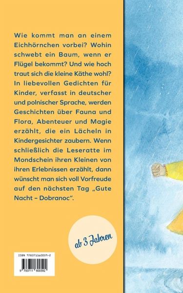Wie kommt man an einem Eichhörnchen vorbei? Wohin schwebt ein Baum, wenn er Flügel bekommt? Und wie hoch traut sich die kleine Käthe wohl? In liebevollen Gedichten für Kinder, verfasst in deutscher und polnischer Sprache, werden Geschichten über Fauna und Flora, Abenteuer und Magie erzählt, die ein Lächeln in Kindergesichter zaubern. Wenn schließlich die Leseratte im Mondschein ihren Kleinen von ihren Erlebnissen erzählt, dann wünscht man sich voll Vorfreude auf den nächsten Tag "Gute Nacht - Dobranoc".