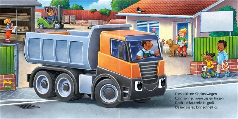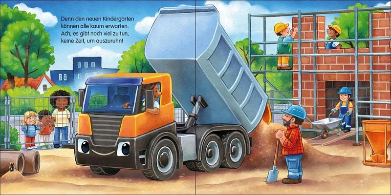 Den ganzen Tag war der kleine Kipplaster auf der Baustelle unterwegs, damit der neue Kindergarten bald fertig wird. Doch jetzt ist Zeit zum Schlafengehen. Zuvor wünscht er noch dem Radlader und dem Betonmischer "Gute Nacht".