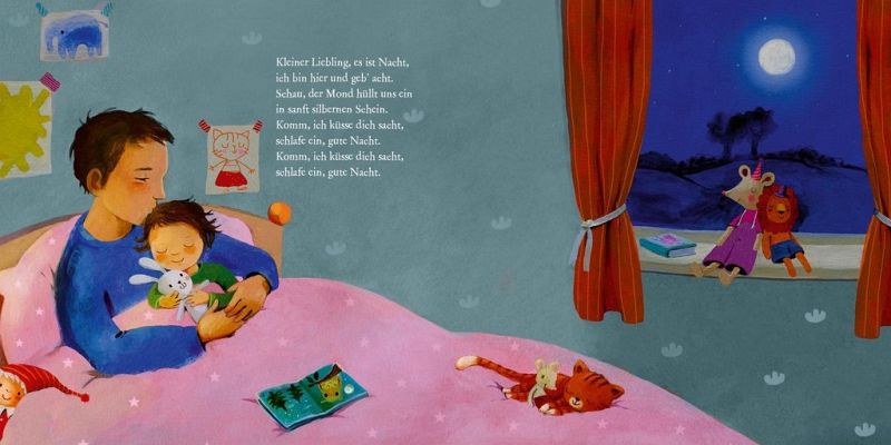 Dieser liebevolle Sammelband ist ein wunderbares Gute-Nacht-Buch für Kinder ab 18 Monaten. Seine drei herzerwärmenden Geschichten eignen sich perfekt für kuschelige Einschlafrituale. Sei es die kleine Maus, die sich die Zähne putzt, den Schlafanzug anzieht und auf den Gute-Nacht-Kuss wartet, die kleine Fledermaus, die vor dem Zubettgehen ihr liebstes Kuscheltier sucht oder liebevolle Einschlafreime, die man zur Melodie von "Guten Abend, gut Nacht" vorsingen kann: Jede Gute-Nacht-Geschichte steckt voller Wärme und Geborgenheit und lässt die Kleinen wohlig und sanft einschlummern.