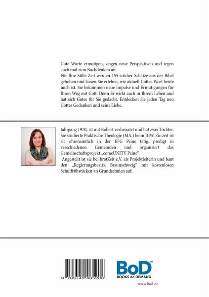 Gute Worte - für die beste Zeit des TagesGute Worte ermutigen, zeigen neue Perspektiven und regen dich auch zum Nachdenken an. Für deine Stille Zeit werden 155 solcher Schätze aus der Bibel gehoben und lassen dich erleben, wie aktuell Gottes Wort heute noch ist. Du bekommst neue Impulse und Ermutigungen für deinen Weg mit Gott. Denn Er wirkt auch in deinem Leben und hat sich Gutes für dich gedacht. Entdecke jeden Tag neu Gottes Gedanken und seine Liebe für dich!Jede Andacht enthält eine kurze Auslegung, persönlichen Zuspruch und Fragen oder Anregungen zur eigenen Reflexion. Sie sind nach Bibelbüchern geordnet, was gut ein paralleles Bibellesen ermöglicht.