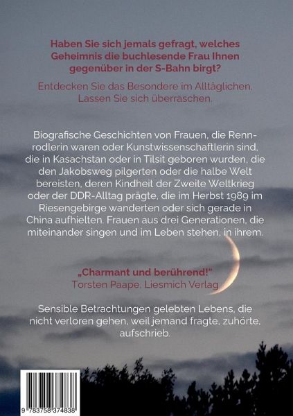 Haben Sie sich jemals gefragt, welches Geheimnis die buchlesende Frau Ihnen gegenüber in der S-Bahn birgt?Entdecken Sie das Besondere im Alltäglichen. Lassen Sie sich überraschen.Biografische Geschichten von Frauen, die Rennrodlerin waren oder Kunstwissenschaftlerin sind, die in Kasachstan oder in Tilsit geboren wurden, die den Jakobsweg pilgerten oder die halbe Welt bereisten, deren Kindheit der Zweite Weltkrieg oder der DDR-Alltag prägte, die im Herbst 1989 im Riesengebirge wanderten oder sich gerade in China aufhielten. Frauen aus drei Generationen, die miteinander singen und im Leben stehen, in ihrem.Sensible Betrachtungen gelebten Lebens, die nicht verloren gehen, weil jemand fragte, zuhörte, aufschrieb."Charmant und berührend"Torsten Paape, Liesmich Verlag