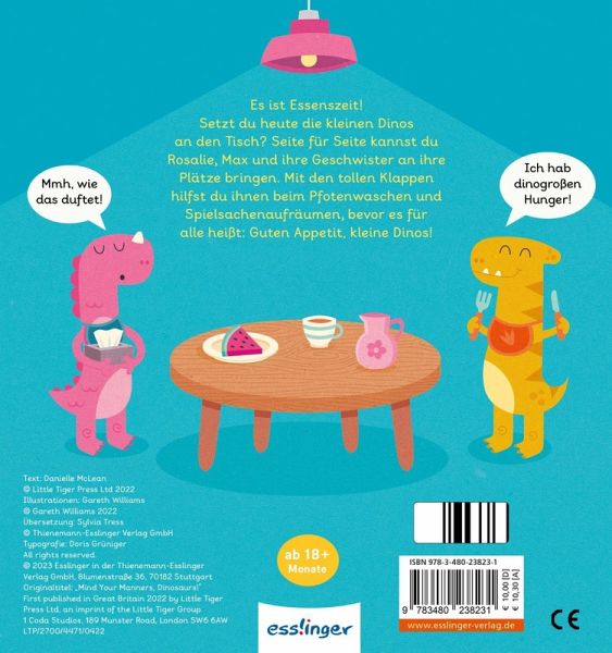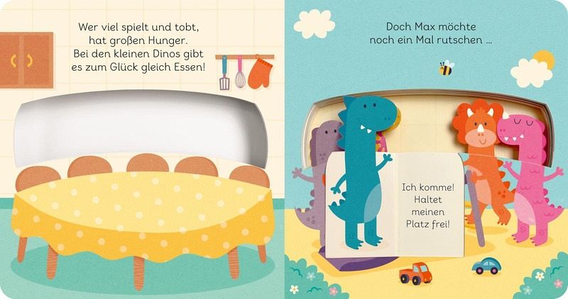 Es ist kinderleicht: einfach umblättern und schon sitzt ein Dino nach dem anderen am Tisch. Auf jeder Doppelseite lädt eine zusätzliche Klappe zum Mitmachen ein, bis es am Ende heißt: "Guten Appetit, liebe Dinos!"