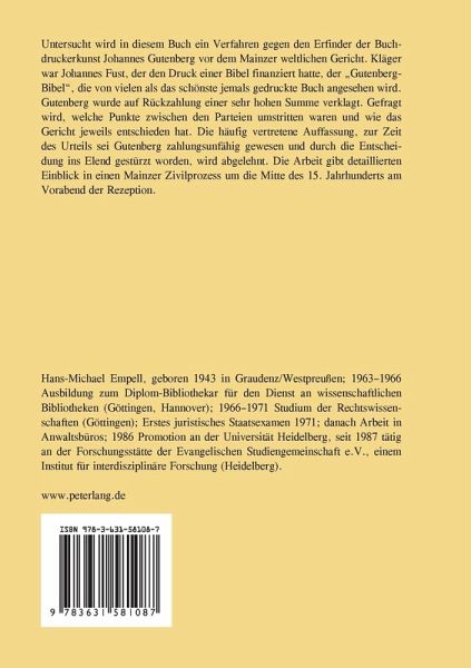 Untersucht wird in diesem Buch ein Verfahren gegen den Erfinder der Buchdruckerkunst Johannes Gutenberg vor dem Mainzer weltlichen Gericht. Kläger war Johannes Fust, der den Druck einer Bibel finanziert hatte, der "Gutenberg-Bibel", die von vielen als das schönste jemals gedruckte Buch angesehen wird. Gutenberg wurde auf Rückzahlung einer sehr hohen Summe verklagt. Gefragt wird, welche Punkte zwischen den Parteien umstritten waren und wie das Gericht jeweils entschieden hat. Die häufig vertretene Auffassung, zur Zeit des Urteils sei Gutenberg zahlungsunfähig gewesen und durch die Entscheidung ins Elend gestürzt worden, wird abgelehnt. Die Arbeit gibt detaillierten Einblick in einen Mainzer Zivilprozess um die Mitte des 15. Jahrhunderts am Vorabend der Rezeption.