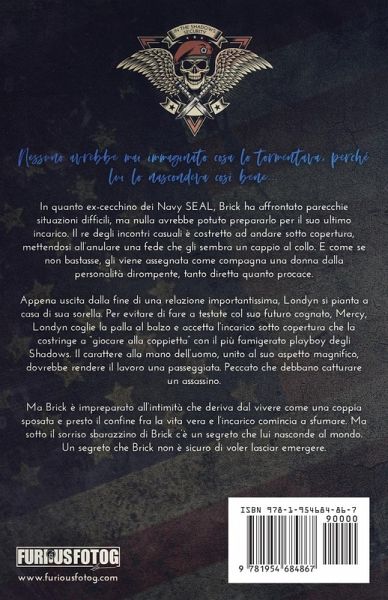 Nessuno avrebbe mai immaginato cosa lo tormentava, perché lui lo nascondeva così bene... In quanto ex-cecchino dei Navy SEAL, Brick ha affrontato parecchie situazioni difficili, ma nulla avrebbe potuto prepararlo per il suo ultimo incarico. Il re degli incontri casuali è costretto ad andare sotto copertura, mettendosi all'anulare una fede che gli sembra un cappio al collo. E come se non bastasse, gli viene assegnata come compagna una donna dalla personalità dirompente, tanto diretta quanto procace. Appena uscita dalla fine di una relazione importantissima, Londyn si pianta a casa di sua sorella. Per evitare di fare a testate col suo futuro cognato, Mercy, Londyn coglie la palla al balzo e accetta l'incarico sotto copertura che la costringe a "giocare alla coppietta" con il più famigerato playboy degli Shadows. Il carattere alla mano dell'uomo, unito al suo aspetto magnifico, dovrebbe rendere il lavoro una passeggiata. Peccato che debbano catturare un assassino. Ma Brick è impreparato all'intimità che deriva dal vivere come una coppia sposata e presto il confine fra la vita vera e l'incarico comincia a sfumare. Ma sotto il sorriso sbarazzino di Brick c'è un segreto che lui nasconde al mondo. Un segreto che Brick non è sicuro di voler lasciar emergere. Nota: Guts & Glory: Brick è il sesti volume della serie "In the Shadows Security", uno spin-off in sei volumi della mia serie "Dirty Angels MC." Sebbene sia consigliabile leggere entrambe le serie in ordine di pubblicazione, ciascun volume può essere letto a se stante. Come per tutti i miei libri, questo ha un lieto fino garantito e non contiene finali in sospeso o tradimenti.