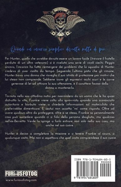Quando un incarico semplice diventa molto di più... Per Hunter, quello che avrebbe dovuto essere un lavoro facile (trovare il fratello perduto di un altro veterano) si è rivelato una serie di vicoli ciechi. Peggio ancora, l'incarico ha fatto riemergere dei problemi che la squadra di Hunter credeva di aver risolto da tempo. Seguendo l'ultima pista che gli rimane, Hunter trova una donna che risveglia il suo istinto di protezione per motivi che lui stesso non comprende. Sebbene siano gli espressivi occhi scuri e le curve generose di lei ad attirare la sua attenzione, è il carattere focoso della donna a mantenerla. Tornata nella sua cittadina natia per nascondersi da un uomo che le ha quasi distrutto la vita, Frankie viene colta alla sprovvista quando uno sconosciuto autoritario e barbuto viene a chiederle informazioni sul motociclista che preferirebbe dimenticare. E costui non accetta "no" come risposta. Oltre ad avere qualcun altro da proteggere, oltre a se stessa, Frankie sa personalmente cosa può succedere quando ci si fida della persona sbagliata, ma qualcosa nell'ex-Berretto Verde la spinge a farlo entrare non solo nella sua casa, ma anche nel suo cuore. Hunter è deciso a completare la missione e a tenere Frankie al sicuro, a qualunque costo. Ma non si aspettava che quel costo comprendesse il suo cuore. Not: Hunter è il terzo volume della serie "In the Shadows Security," uno spin-off in sei volumi della mia serie "Dirty Angels MC." Sebbene sia consigliabile leggere entrambe le serie in ordine cronologico, ciascun volume è autoconclusivo. Come per tutti i miei libri, il lieto fine è garantito e non ci sono finali in sospeso o tradimenti.