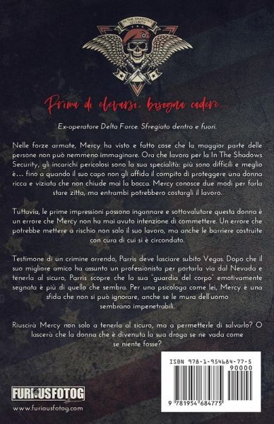 Prima di elevarsi, bisogna cadere... Ex-operatore Delta Force. Sfregiato dentro e fuori. Nelle forze armate, Mercy ha visto e fatto cose che la maggior parte delle persone non può nemmeno immaginare. Ora che lavora per la In The Shadows Security, gli incarichi pericolosi sono la sua specialità: più sono difficili e meglio è... fino a quando il suo capo non gli affida il compito di proteggere una donna ricca e viziata che non chiude mai la bocca. Mercy conosce due modi per farla stare zitta, ma entrambi potrebbero costargli il lavoro. Tuttavia, le prime impressioni possono ingannare e sottovalutare questa donna è un errore che Mercy non ha mai avuto intenzione di commettere. Un errore che potrebbe mettere a rischio non solo il suo lavoro, ma anche le barriere costruite con cura di cui si è circondato. Testimone di un crimine orrendo, Parris deve lasciare subito Vegas. Dopo che il suo migliore amico ha assunto un professionista per portarla via dal Nevada e tenerla al sicuro, Parris scopre che la sua "guardia del corpo" emotivamente segnata è più di quello che sembra. Per una psicologa come lei, Mercy è una sfida che non si può ignorare, anche se le mura dell'uomo sembrano impenetrabili. Riuscirà Mercy non solo a tenerla al sicuro, ma a permetterle di salvarlo? O lascerà che la donna che è divenuta la sua droga se ne vada come se niente fosse? Nota: Fama e Fegato: Mercy è il primo volume della serie "In The Shadows Security," uno spin-off in sei volumi della mia serie "Dirty Angels MC." Sebbene sia consigliabile leggere entrambe le serie in ordine cronologico, ciascun volume è autoconclusivo. Come per tutti i miei libri, il lieto fine è garantito e non ci sono finali in sospeso o tradimenti.