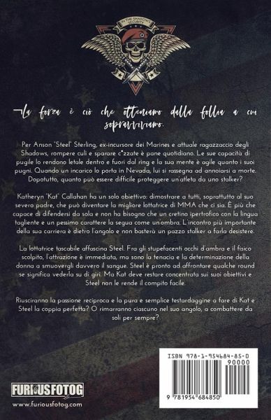 La forza è ciò che otteniamo dalla follia a cui sopravviviamo. Per Anson "Steel" Sterling, ex-incursore dei Marines e attuale ragazzaccio degli Shadows, rompere culi e sparare c*zzate è pane quotidiano. Le sue capacità di pugile lo rendono letale dentro e fuori dal ring e la sua mente è agile quanto i suoi pugni. Quando un incarico lo porta in Nevada, lui si rassegna ad annoiarsi a morte. Dopotutto, quanto può essere difficile proteggere un'atleta da uno stalker? Katheryn "Kat" Callahan ha un solo obiettivo: dimostrare a tutti, soprattutto al suo severo padre, che può diventare la migliore lottatrice di MMA che ci sia. È più che capace di difendersi da sola e non ha bisogno che un cretino ipertrofico con la lingua tagliente e un pessimo carattere la segua come un'ombra. L'incontro più importante della sua carriera è dietro l'angolo e non basterà un pazzo stalker a farla desistere. La lottatrice tascabile affascina Steel. Fra gli stupefacenti occhi d'ambra e il fisico scolpito, l'attrazione è immediata, ma sono la tenacia e la determinazione della donna a smuovergli davvero il sangue. Steel è pronto ad affrontare qualche round se significa vederla su di giri. Ma Kat deve restare concentrata sui suoi obiettivi e Steel non le rende il compito facile. Riusciranno la passione reciproca e la pura e semplice testardaggine a fare di Kat e Steel la coppia perfetta? O rimarranno ciascuno nel suo angolo, a combattere da soli per sempre? Nota: Guts & Glory: Steel è il quinto volume della serie "In the Shadows Security", uno spin-off in sei volumi della mia serie "Dirty Angels MC." Sebbene sia consigliabile leggere entrambe le serie in ordine di pubblicazione, ciascun volume può essere letto a se stante. Come per tutti i miei libri, questo ha un lieto fino garantito e non contiene finali in sospeso o tradimenti.