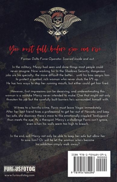 You must fall before you can rise... Former Delta Force Operator. Scarred inside and out. In the military, Mercy had seen and done things most people could never imagine. Now working for In the Shadows Security, dangerous jobs are his specialty, the more difficult the better... until his boss assigns him to protect a spoiled, rich woman who never shuts the h*ll up. He has two ways to stop her running mouth, but either could get him fired. However, first impressions can be deceiving, and underestimating this woman is a mistake Mercy never intended to make. One that might not only threaten his job but the carefully built barriers he's surrounded himself with. Witness to a horrific crime, Parris must leave Vegas immediately. After her best friend hires a professional to get her out of Nevada and keep her safe, she discovers there's more to this emotionally crippled "bodyguard" than meets the eye. As a therapist, Mercy's a challenge Parris can't ignore, even when his walls seem too high to breach. In the end, will Mercy not only be able to keep her safe but allow her to save him? Or will he let the woman who's become his addiction simply walk away? Note: Mercy is the first book of the Guts & Glory series, a six-book spin-off from my Dirty Angels MC series. While it's recommended to read both series in order, each book can be read as a stand-alone. As with all my books, this has an HEA and no cliffhanger or cheating.