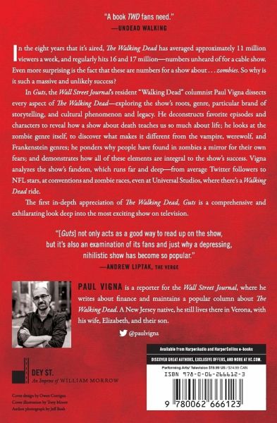 In the eight years that it’s aired, The Walking Dead has averaged approximately 11 million viewers a week, and regularly hits 16 and 17 million—numbers unheard of for a cable show. Even more surprising is the fact that these are numbers for a show about . . . zombies. So why is it such a massive and unlikely success? In Guts, the Wall Street Journal’s resident “Walking Dead” columnist Paul Vigna dissects every aspect of The Walking Dead—exploring the show’s roots, genre, particular brand of storytelling, and cultural phenomenon and legacy. He deconstructs favorite episodes and characters to reveal how a show about death teaches us so much about life; he looks at the zombie genre itself, to discover what makes it different from the vampire, werewolf, and Frankenstein genres; he ponders why people have found in zombies a mirror for their own fears; and demonstrates how all of these elements are integral to the show’s success. Vigna analyzes the show’s fandom, which runs far and deep—from average Twitter followers to NFL stars, at conventions and zombie races, even at Universal Studios, where there’s a Walking Dead ride. The first in-depth appreciation of The Walking Dead, Guts is a comprehensive and exhilarating look deep into the most exciting show on television.