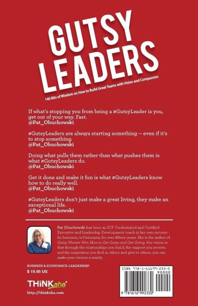 In Gutsy Leaders: 140 Bits of Wisdom on How to Build Great Teams with Vision and Compassion, Pat Obuchowski, a credentialed and certified leadership development coach, shares her collection of insights into the world of successful, courageous, and gutsy leaders in the form of tweetable value-add tips. If you are not being bold in your leadership by pushing yourself to be consistently better, this book will help you get gutsy and get going. Pat's years of experience as CEO (Chief Empowerment Officer) of inVisionaria, as well as her post-graduate studies in neuroscience of leadership and an MBA and a BA in psychology and sociology, allow her to help her clients understand human behavior. This understanding is key to being a great leader who builds great teams with vision and compassion. This book is not only about leading others but also about self-leadership. It will help you get a sense of who you are, in addition to helping you influence your communication, emotions, and behaviors. Ready to play a Bigger Game and become a game changer in your leadership? This is the book for you. Gutsy Leaders is part of the THiNKaha series, whose slim and handy books contain 140 well-thought-out AHAmessages. Increase your online influence by picking up AHAthat, and easily share quotes from this book on Twitter, Facebook, LinkedIn, and Google+ via this link: http://aha.pub/GutsyLeaders