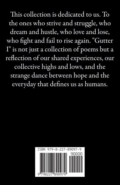 This collection is dedicated to you. To those who strive and struggle, who dream and despair, who love and lose, who fight and fail and rise again. "Gutter I" is not just a collection of poems but a reflection of our shared experiences,our collective highs and lows, and the intricate dance between hope and reality that defines us all.