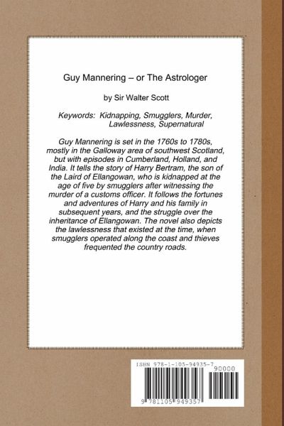 Guy Mannering is set in the 1760s to 1780s, mostly in the Galloway area of southwest Scotland, but with episodes in Cumberland, Holland, and India. It tells the story of Harry Bertram, the son of the Laird of Ellangowan, who is kidnapped at the age of five by smugglers after witnessing the murder of a customs officer. It follows the fortunes and adventures of Harry and his family in subsequent years, and the struggle over the inheritance of Ellangowan. The novel also depicts the lawlessness that existed at the time, when smugglers operated along the coast and thieves frequented the country roads.