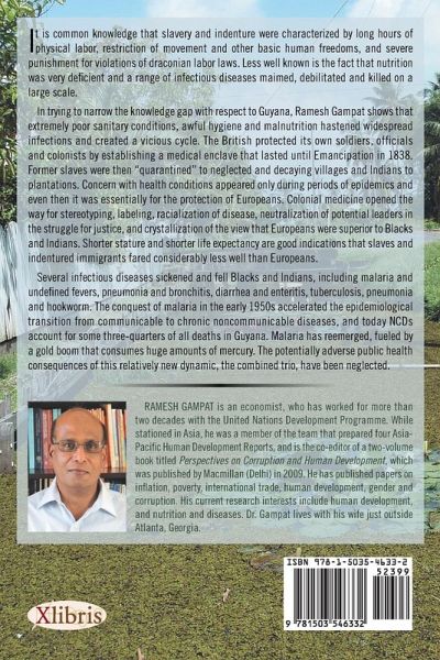 " It is common knowledge that slavery and indenture were characterized by long hours of physical labor, restriction of movement and other basic human freedoms, and severe punishment for violations of draconian labor laws. Less well known is the fact that nutrition was very deficient and a range of infectious diseases maimed, debilitated and killed on a large scale. In trying to narrow the knowledge gap with respect to Guyana, Ramesh Gampat shows that extremely poor sanitary conditions, awful hygiene and malnutrition hastened widespread infections and created a vicious cycle. The British protected its own soldiers, officials and colonists by establishing a medical enclave that lasted until Emancipation in 1838. Former slaves were then "quarantined" to neglected and decaying villages and Indians to plantations. Concern with health conditions appeared only during periods of epidemics and even then it was essentially for the protection of Europeans. Colonial medicine opened the way for stereotyping, labeling, racialization of disease, neutralization of potential leaders in the struggle for justice, and crystallization of the view that Europeans were superior to Blacks and Indians. Shorter stature and shorter life expectancy are good indications that slaves and indentured immigrants fared considerably less well than Europeans. Several infectious diseases sickened and fell Blacks and Indians, including malaria and undefined fevers, pneumonia and bronchitis, diarrhea and enteritis, tuberculosis, pneumonia and hookworm. The conquest of malaria in the early 1950s accelerated the epidemiological transition from communicable to chronic noncommunicable diseases, and today NCDs account for some three-quarters of all deaths in Guyana. Malaria has reemerged, fueled by a gold boom that consumes huge amounts of mercury. The potentially adverse public health consequences of this relatively new dynamic, the combined trio, have been neglected. "