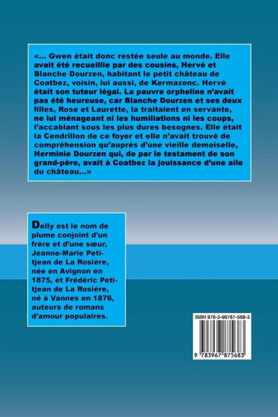 ... Gwen était donc restée seule au monde. Elle avait été recueillie par des cousins, Hervé et Blanche Dourzen, habitant le petit château de Coatbez, voisin, lui aussi, de Kermazenc. Hervé était son tuteur légal. La pauvre orpheline n'avait pas été heureuse, car Blanche Dourzen et ses deux filles, Rose et Laurette, la traitaient en servante, ne lui ménageant ni les humiliations ni les coups, l'accablant sous les plus dures besognes. Elle était la Cendrillon de ce foyer et elle n'avait trouvé de compréhension qu'auprès d'une vieille demoiselle, Herminie Dourzen qui, de par le testament de son grand-père, avait à Coatbez la jouissance d'une aile du château...