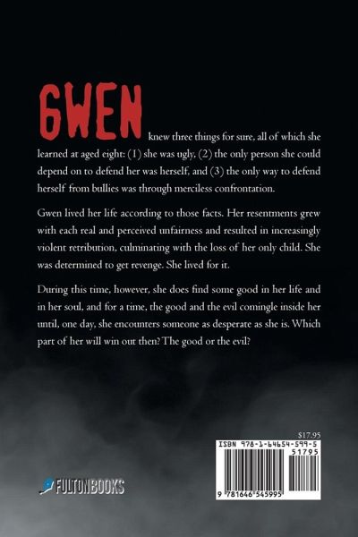 Gwen knew three things for sure, all of which she learned at aged eight: (1) she was ugly, (2) the only person she could depend on to defend her was herself, and (3) the only way to defend herself from bullies was through merciless confrontation. Gwen lived her life according to those facts. Her resentments grew with each real and perceived unfairness and resulted in increasingly violent retribution, culminating with the loss of her only child. She was determined to get revenge. She lived for it. During this time, however, she does find some good in her life and in her soul, and for a time, the good and the evil comingle inside her until, one day, she encounters someone as desperate as she is. Which part of her will win out then? The good or the evil?