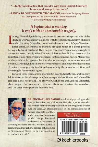 "¿. . . a thoughtful and highly entertaining tale.¿" -Alex DeMille, New York Times bestselling author ". . . highly original tale that crackles with fresh insight, Southern humor, and savage irreverence." -Linda Bloodworth Thomason, creator of Designing Women, 2024 recipient of the Writer's Guild Laurel Award for Television Writing Achievement It begins with a monkey. It ends with an inescapable tragedy. In 1957, Gwendolyn is living the domestic dream as the prized wife of the dashing Dr. Paul Stanley Bollinger, with three beautiful, healthy children and a charming Edwardian home in the historic town of Cape Girardeau. Enter Eddie, an inebriated monkey brought home as a poker prize by her equally drunk husband. Thus begins Gwendolyn's yearslong struggle to domesticate two unruly fellas. Eddie is a hilarious handful but no match for Paul Stanley and his increasing penchant for bourbon and nurses. Meanwhile, as the predictable 1950s evolve into the increasingly tumultuous '60s and beyond, Gwendolyn finds her conservative beliefs challenged by the realities of racism, homophobia, traditional masculinity, the sexual revolution, and the struggle for women's rights. For over forty years, a time marked by hilarity, heartbreak, and tragedy, Eddie serves as her clown prince, her unexpected confidant, and when all is said and done, her solace. The story of Gwendolyn and Eddie is ultimately about cages-the ones we are born into, those we construct for ourselves, and the ones we impose on those we love.