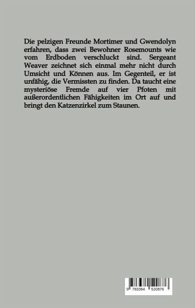 Dies ist der dritte Teil meiner Gwendolyn & Mortimer Trilogie. Die pelzigen Freunde Mortimer und Gwendolyn erfahren, dass zwei Bewohner Rosemounts wie vom Erdboden verschluckt sind. Sergeant Weaver zeichnet sich einmal mehr nicht durch Umsicht und Können aus. Im Gegenteil, er ist unfähig, die Vermissten zu finden. Da taucht eine mysteriöse Fremde auf vier Pfoten mit außerordentlichen Fähigkeiten im Ort auf und bringt den Katzenzirkel zum Staunen.