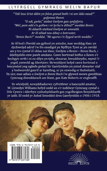 W. Llewelyn Williams Gwilym a Benni Bach "Odi lesu Grist ddim yn folon gneud beth i ni am iddo neud?" gofynnai Benni. "O odi, gwlei," atebai Gwilym gan synfyfyrio. "Wel, pam odd e'n gellwn i ni lychu'n dillad?" meddai Benni. Ni ddaeth atebiad Gwilym ar unwaith. Ar ôl eiliad neu ddwy o betruster, "Benni Bach?" meddai. "Mi agores i'n llyged wrth weddïo." Ar ôl bod i ffwrdd am nifer o yn astudio, mae meddyg ifanc yn dychwelyd adref i'w fro enedigol yn Nyffryn Tywi ac yn cwrdd am y tro cyntaf â'i ddau nai ifanc, Gwilym a Benni-Benni Bach, i ddefnyddio enw pawb amdano. Cawn bortread hoffus a llawn o'r ddau fachgen wrth i ni eu dilyn yn tyfu, chwarae, breuddwydio, mynd i'r ysgol, ymweld ag Abertawe: thrwyddynt hefyd cawn bortread o lencyndod yng nghefn gwlad Sir Gaerfyrddin yn ystod chwarter olaf y bedwaredd ganrif ar bymtheg, ac yn enwedig ei thafodiaith. Yn wleidydd, newyddiadurwr, cyfreithiwr a hanesydd amatur, William Llewelyn Williams hefyd oedd ymhlith y nofelwyr Cymraeg cyntaf o Dde Cymru. Ef oedd yr Aelod Seneddol dros Gaerfyrddin o 1906 i 1918.