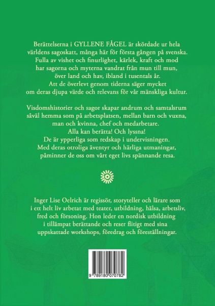 Berättelserna i GYLLENE FÅGEL är skördade ur hela världens sagoskatt, många för första gång på svenska. Fulla av vishet och finurlighet, kärlek, kraft och mod har sagorna och myterna vandrat från mun till öra över land och hav, ibland i tusentals år. Att de överlevt genom tiderna säger mycket om deras djupa värde och relevans för vår mänskliga kultur. Visdomshistorier och sagor skapar andrum och samtalsrum såväl hemma som på arbetsplatsen, mellan barn och vuxna, man och kvinna, chef och medarbetare. Alla kan berätta! Och lyssna! De är ypperliga som redskap i undervisningen. Med deras otroliga äventyr och härliga utmaningar, påminner de oss om vår egen spännande resa genom livet. Berättelser ur innehållet: Kungen som ville ha månen (Karibien) Jack och Döden (Skottland) Leopardkvinnan (Liberia) Det knotiga trädet (Zen tradition) Sagopåsen (Japan) Den gamle björnjägaren (Alaska) Varför himlen är långt borta (Nigeria) Gyllene Fågel (England) Prinsen med åsneöron (Portugal) med många fler!