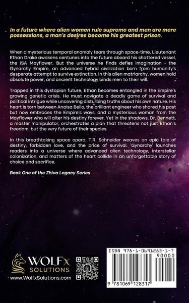 In a future where alien women rule supreme and men are mere possessions, a man's desires become his greatest prison. When a mysterious temporal anomaly tears through space-time, Lieutenant Ethan Drake awakens centuries into the future aboard his shattered vessel, the ISA Mayflower. But the universe he finds defies imagination - the Gynarchy Empire, an advanced hybrid civilization born from humanity's desperate attempt to survive extinction. In this alien matriarchy, women hold absolute power, and ancient technology binds men to their will. Trapped in this dystopian future, Ethan becomes entangled in the Empire's growing genetic crisis. He must navigate a deadly game of survival and political intrigue while uncovering disturbing truths about his own nature. His heart is torn between Anaisa Bello, the brilliant engineer who shared his past but now embraces the Empire's ways and a mysterious woman from the Mayflower who will alter his destiny forever. Yet, in the shadows, Dr. Bennett, a master manipulator, orchestrates a plan that threatens not just Ethan's freedom but the very future of their species. In this breathtaking space opera, T.R. Schneider weaves an epic tale of destiny, forbidden love, and the price of survival. 'Gynarchy' launches readers into a universe where advanced alien technology, interstellar colonization, and matters of the heart collide in an unforgettable story of choice and sacrifice. Book One of the Zhiva Legacy Series