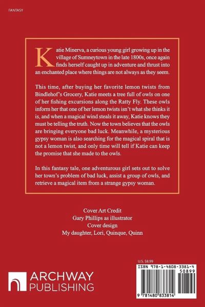 Katie Minerva, a curious young girl growing up in the village of Sumneytown in the late 1800s, once again finds herself caught up in adventure and thrust into an enchanted place where things are not always as they seem. This time, after buying her favorite lemon twists from Bindlehof’s Grocery, Katie meets a tree full of owls on one of her fishing excursions along the Ratty Fly. These owls inform her that one of her lemon twists isn’t what she thinks it is, and when a magical wind steals it away, Katie knows they must be telling the truth. Now the town believes that the owls are bringing everyone bad luck. Meanwhile, a mysterious gypsy woman is also searching for the magical spiral that is not a lemon twist, and only time will tell if Katie can keep the promise that she made to the owls. In this fantasy tale, one adventurous girl sets out to solve her town’s problem of bad luck, assist a group of owls, and retrieve a magical item from a strange gypsy woman.