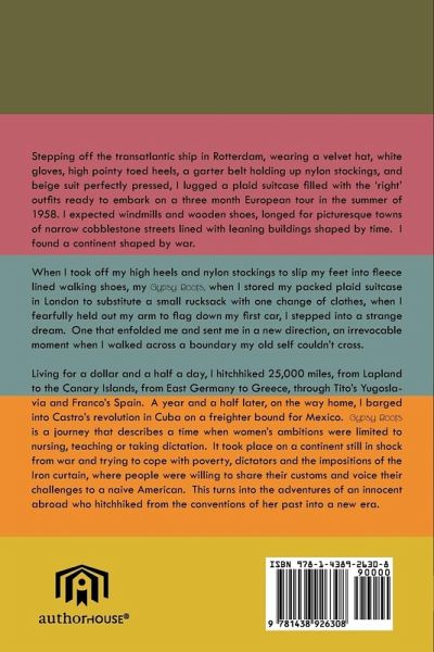 Stepping off the transatlantic ship in Rotterdam, wearing a velvet hat, white gloves, high pointy toed heels, a garter belt holding up nylon stockings, and beige suit perfectly pressed, I lugged a plaid suitcase filled with the 'right' outfits ready to embark on a three month European tour in the summer of 1958. I expected windmills and wooden shoes, longed for picturesque towns of narrow cobblestone streets lined with leaning buildings shaped by time. I found a continent shaped by war. When I took off my high heels and nylon stockings to slip my feet into fleece lined walking shoes, my Gypsy Boots, when I stored my packed plaid suitcase in London to substitute a small rucksack with one change of clothes, when I fearfully held out my arm to flag down my first car, I stepped into a strange dream. One that enfolded me and sent me in a new direction, an irrevocable moment when I walked across a boundary my old self couldn't cross. Living for a dollar and a half a day, I hitchhiked 25,000 miles, from Lapland to the Canary Islands, from East Germany to Greece, through Tito's Yugoslavia and Franco's Spain. A year and a half later, on the way home, I barged into Castro's revolution in Cuba on a freighter bound for Mexico. Gypsy Boots is a journey that describes a time when women's ambitions were limited to nursing, teaching or taking dictation. It took place on a continent still in shock from war and trying to cope with poverty, dictators and the impositions of the Iron curtain, where people were willing to share their customs and voice their challenges to a naive American. This turns into the adventures of an innocent abroad who hitchhiked from the conventions of her past into a new era.