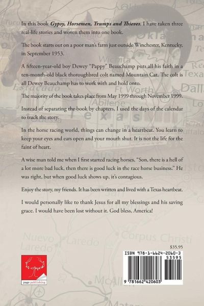 In this book Gypsy, Horsemen, Trumps and Thieves, I have taken three real-life stories and woven them into one book. The book starts out on a poor man's farm just outside Winchester, Kentucky, in September 1953. A fifteen-year-old boy Dewey "Pappy" Beauchamp puts all his faith in a ten-month-old black thoroughbred colt named Mountain Cat. The colt is all Dewey Beauchamp has to work with and hold onto. The majority of the book takes place from May 1999 through November 1999. Instead of separating the book by chapters, I used the days of the calendar to track the story. In the horse racing world, things can change in a heartbeat. You learn to keep your eyes and ears open and your mouth shut. It is not the life for the faint of heart. A wise man told me when I first started racing horses, "Son, there is a hell of a lot more bad luck, then there is good luck in the race horse business." He was right, but when good luck shows up, it's contagious. Enjoy the story, my friends. It has been written and lived with a Texas heartbeat. I would personally like to thank Jesus for all my blessings and his saving grace. I would have been lost without it. God bless, America!